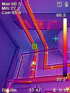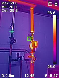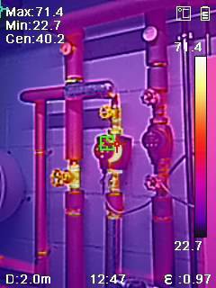 Dämmen Sie Ihre Heizungsrohre im Heizraum! Durch ungedämmte Rohre wird der Raum unnötig aufgeheizt und es geht viel Energie verloren. Auf den Infrarotbildern ist zu sehen, dass ungedämmte Absperrhähne, Punpen und Rohre bis zu 71°C heiß werden. Dadurch wird der Raum auf 30° C und mehr aufgeheizt.